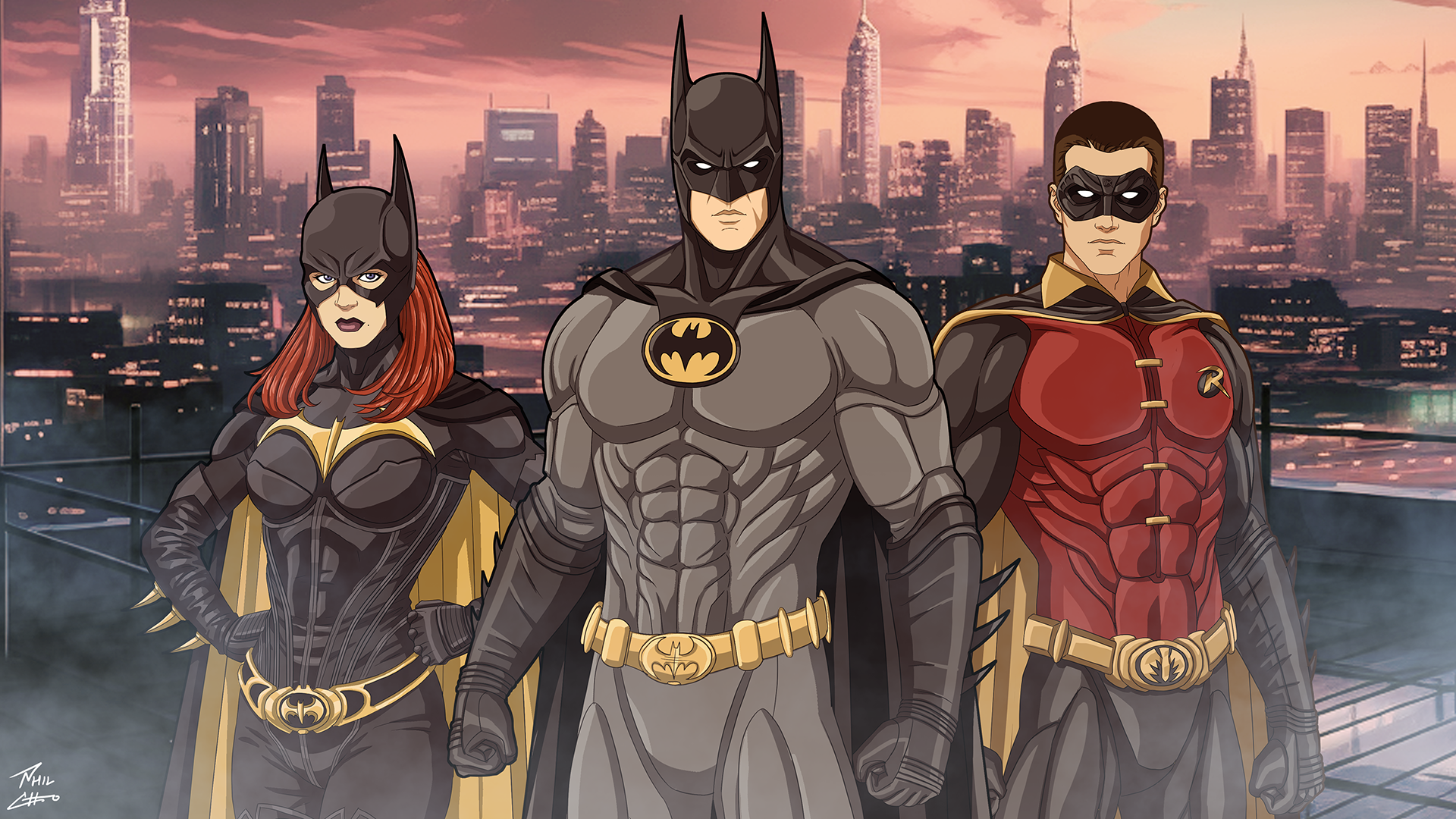 The Bat-Family from the 1966 Batman TV series in darker colors, featuring Batman (Adam West), Robin (Burt Ward), and Batgirl (Yvonne Craig).